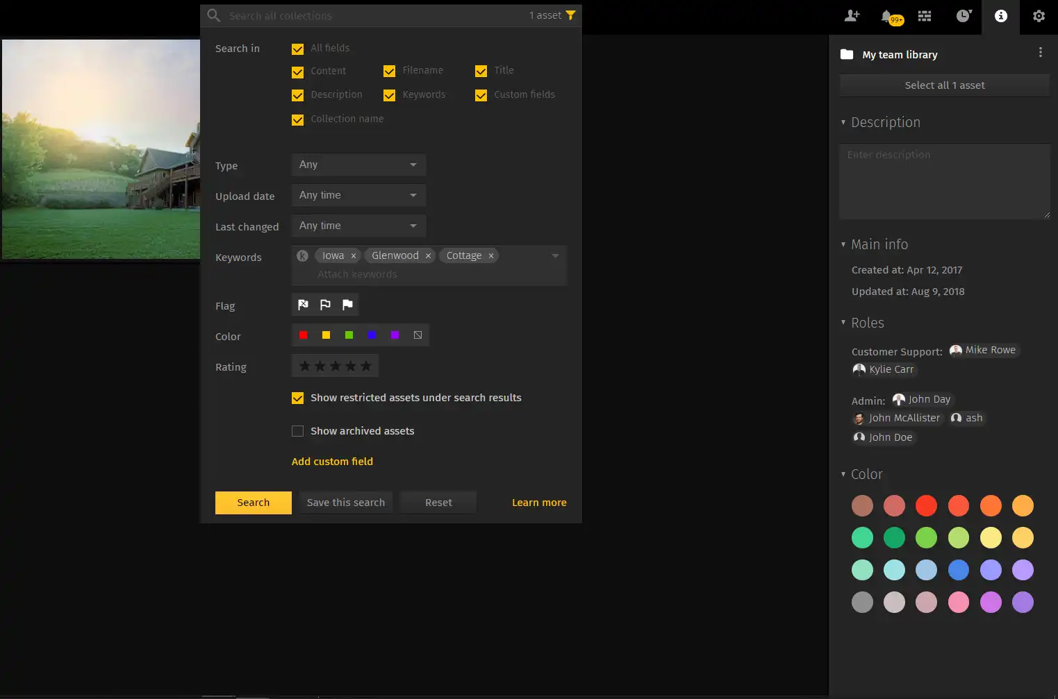 Pics.io uses multiple formats of metadata and it also allows you to create your own metadata fields. This is especially useful for things that are hard to describe visually and are subject to constant change. For example, if you're using digital asset management to track your eCommerce stock, you can add custom field with the asset's price. That way, you can always filter for products with the price that you need.