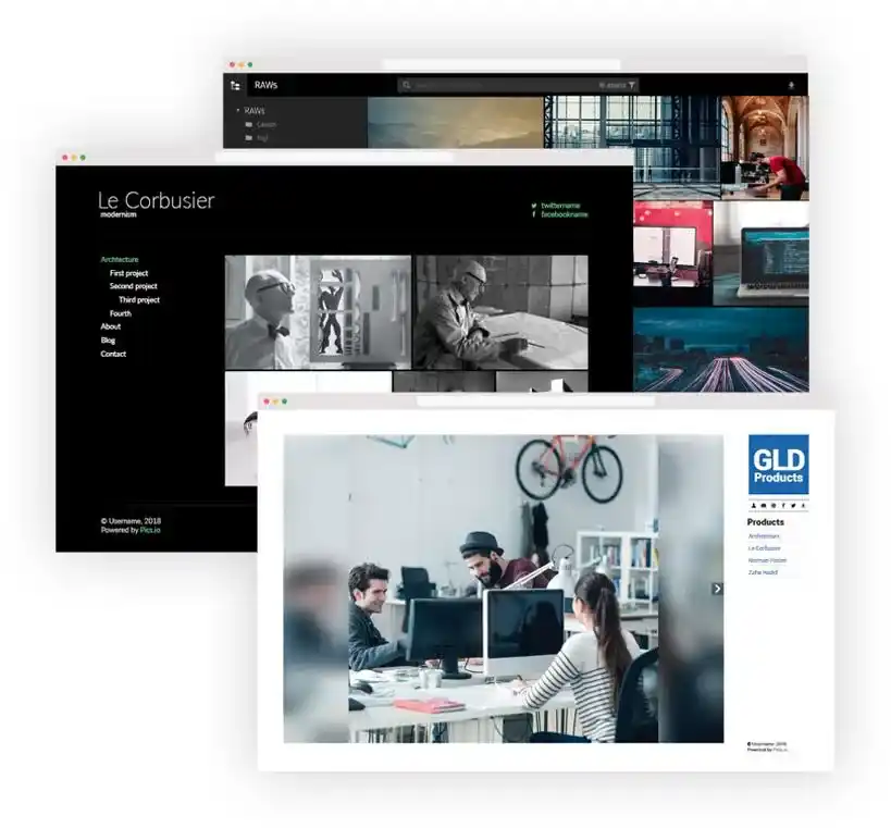 You create these websites based on your Pics.io collections i.e. folders, choosing one out of ten templates. You’re free to change every single aspect of your improvised website like your visitors’ actions (viewing only/downloading/leaving comments), the number of images on the Home page, visible/absent contact details or “About” page.