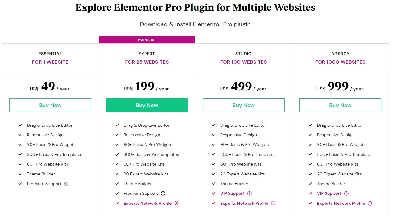 In addition to an extensive free plan, Elementor offers 4 subscription plans: