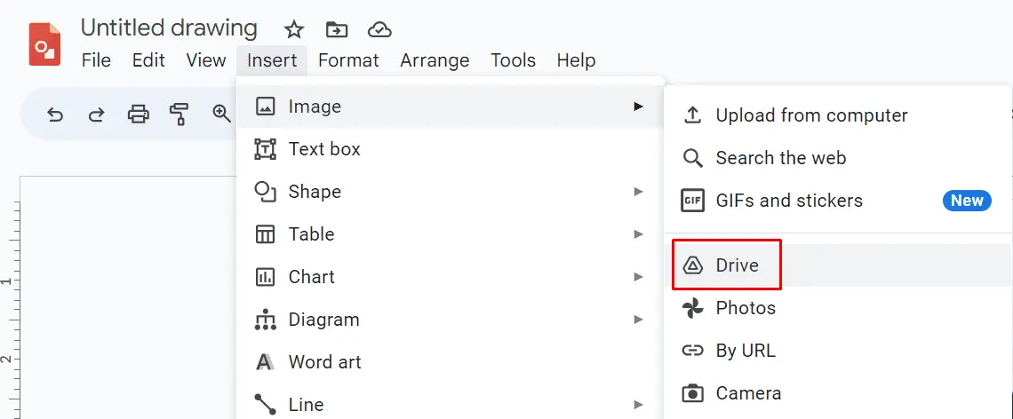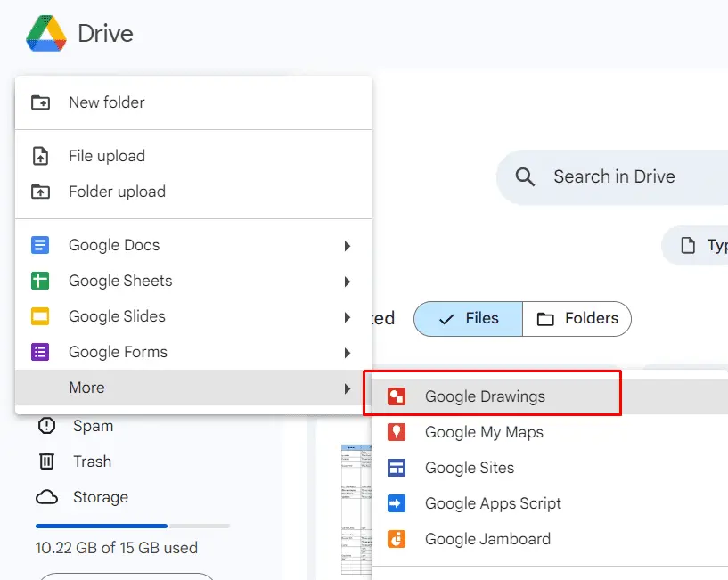 - Sign in to your Google Drive account. Click New button, hover over More section, and select Drawings.