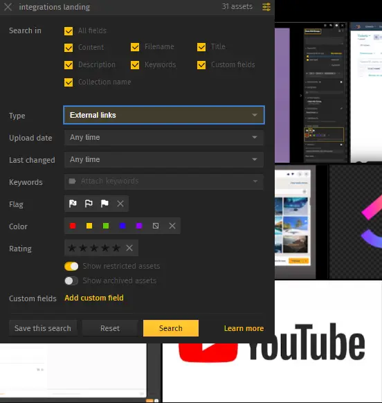 So now that I have all materials related to this project in my DAM, I can use our beloved search to find all the information that I need. If I care only about external assets, I can further specify my search like so: