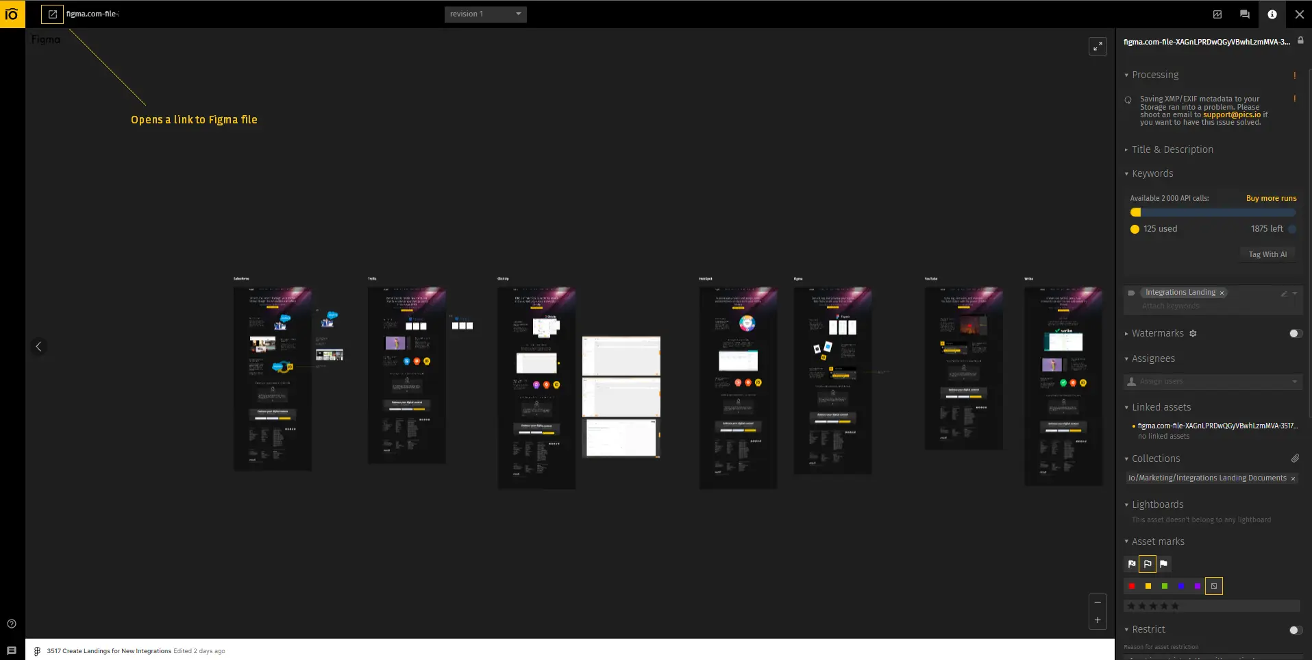 For Figma, opening the project inside Pics.io lets you zoom in and scroll through the document as you would albeit without all the fancy commenting bits and bobs. It works well enough if you need to take a quick glance at the file and if you need any more details, you can always click through to work with Figma directly: