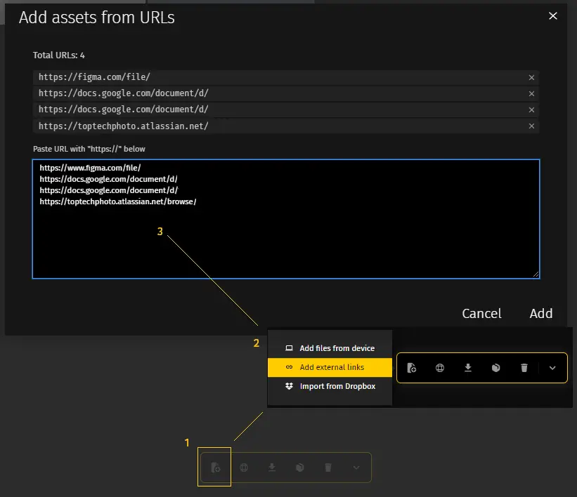 - Add links to all external sources of information (Figma, JIRA, Google Doc, etc.) to your Pics.io DAM, and click Add