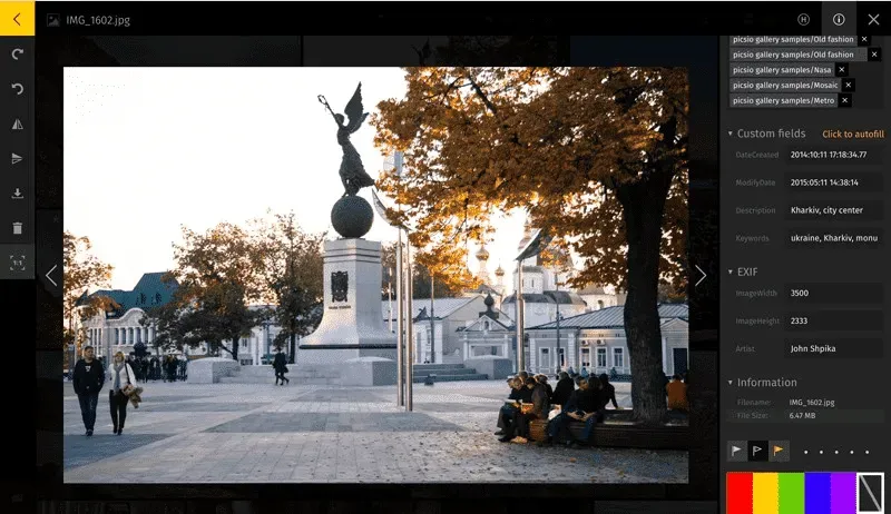 Now you may go to any of your image, open info panel, find custom fields section and press ‘Click to autofill’ near ‘Custom fields’ section. In a second pics.io will parse the information, make it searcheable and will show it to you: