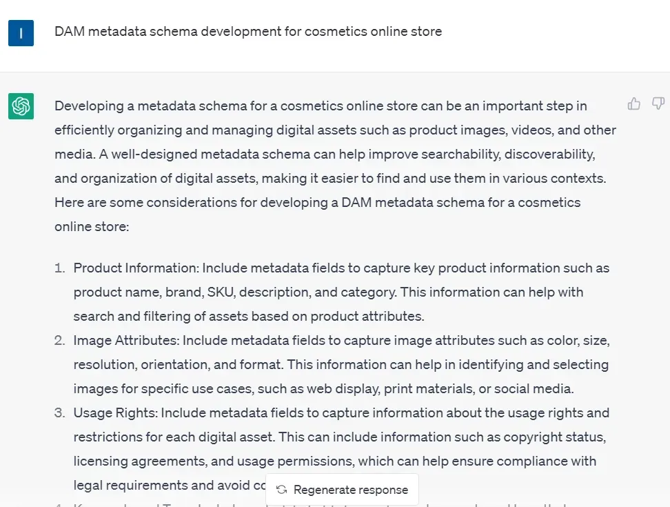 We tested DAM metadata schema development with ChatGTP for an online cosmetics shop and received some useful pieces of advice. For instance, such metadata fields as product name, brand, and category should be added.