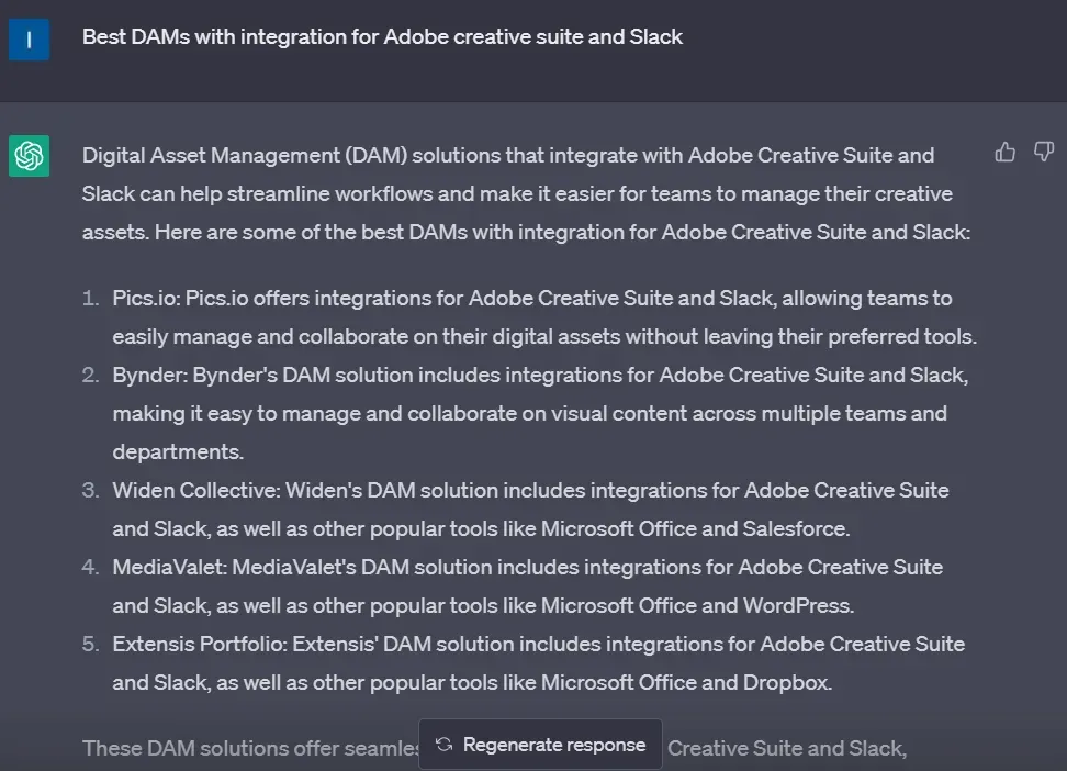 In the screenshot above, you can see that ChatGPT also briefly overviews the requested functions in every DAM system, as well as other integrations available. All in all, it can give tailored recommendations for DAM tools that meet an organization's specific needs and requirements.