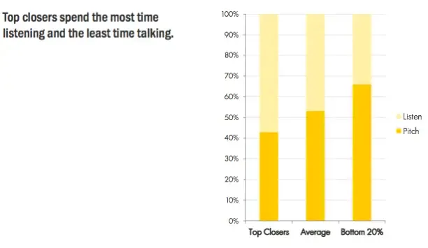 According to a study from Gong, a talk-to-listen ratio of about 43:57 has the highest conversion rate. Balance the speaking-to-listening ratio so that you can listen to the other party, and they can listen to you.