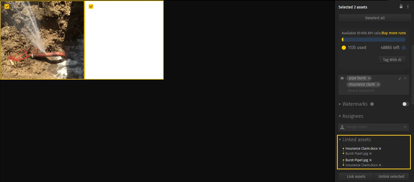 Another great way to make sure that assets are never scattered around is by linking them together. Simply click on the thumbnails of two assets that you need to link and click Link assets.