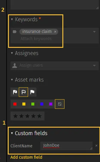 Whenever you upload a new asset to Pics.io, you can add metadata, using a side panel. Two of the most useful things to add would be Custom Fields (1) and Keywords (2)