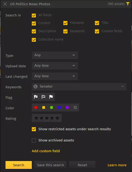 Using our previous example, you can have one big collection named US Politics News Photos. And then, while you’re in that collection, you can filter photos not by their names but just by specifying keywords like Senator, or large panning view to give you an exact photo that you need.