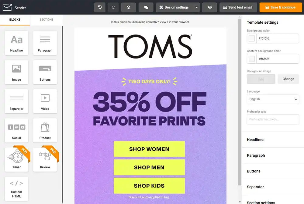 One of the great email banners you’ve seen above - one from Toms - was actually made by Sender.net drag-n-drop email design builder!