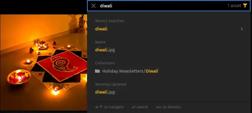 Obviously, for some search functions to work properly, you’ll need to do some initial setup like assigning precise keywords to all assets associated with Diwali, for example. But this initial configuration will help you many times over because you’ll always know where to look for your assets.