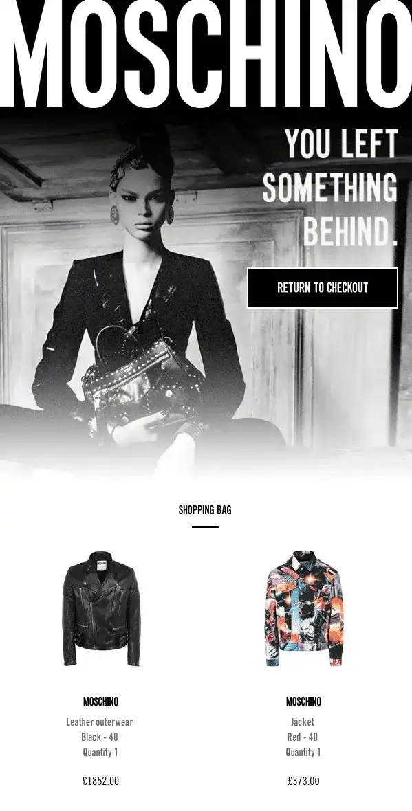 The fashion and apparel brand, Moschino, has a discerning image reflecting in their recovery email campaign. Other outstanding features include a model’s black and white photo, a “You left something behind” caption, and a CTA, “Return to checkout.”