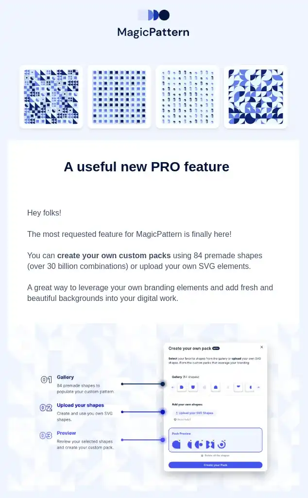 MagicPattern shows how can you lead in by showing value and only then moving on to the announcement. At the very top of the page, they show new patterns that they’ve created using their new feature - custom pattern editor. It then shows a quick demo on how users can use that feature themselves, motivating them to try it out.