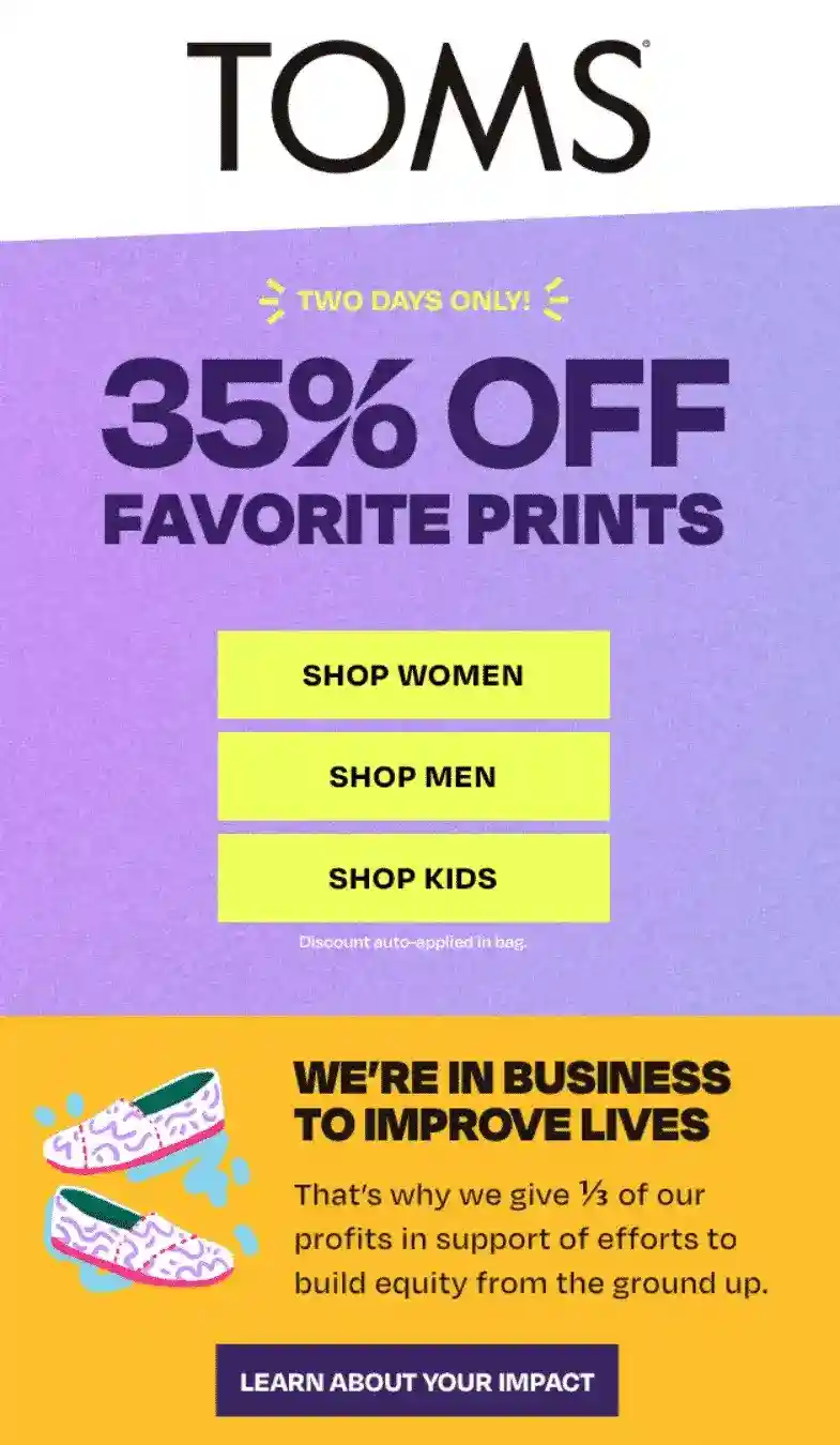 This email design is a good example of how to structure information if you want to tell subscribers several things at once. The deal itself - 35% off - takes ⅔ of the banner space, while also providing direct links to the store. The bottom portion tells about the company’s message and how they (along with their customers) help to build equity. Also, note how the message about “⅓ of our profits” takes up ⅓ of the banner space. Pretty clever.